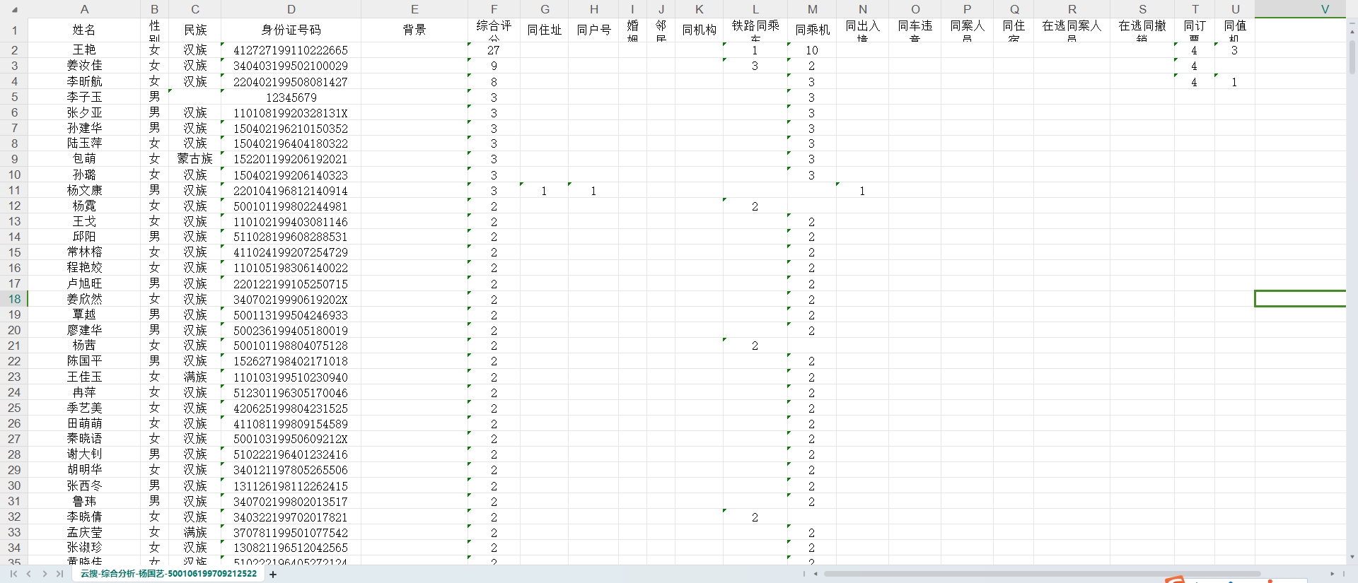 评分的维度有很多,每一项关联,即加一分。维度分别是:同住址,同出生日期,婚姻,邻居,同机构,铁路同乘车,同乘机,同出入境,同用驾照,同车违规,同住宿,在逃违规,特殊加分。